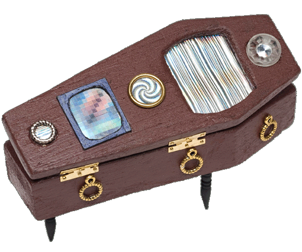 LATE #23 Philo Farnsworth 4 1/4" x 1 3/4" x 1 3/4" mixed media - carved wood, paint, diffraction grating, beads