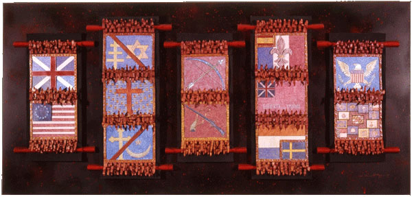 Sgraffito and mixed media on masonite (metals, museum board, paint)